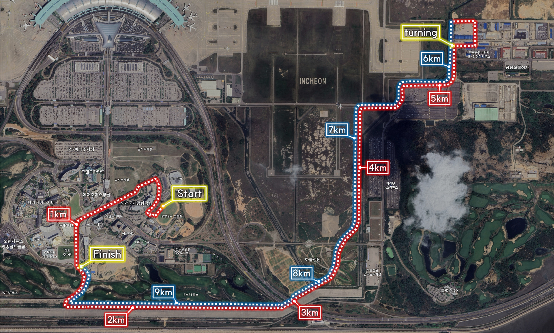 공항공사 축구장에서 출발해서 인근도로 및 자전거도로를 달리는 10km 단일코스입니다.